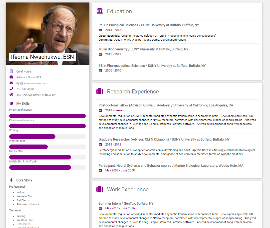 R2Resume provides a flexible means for customizating the look of your site. With various templates and sections usable, you may add or remove items in order to create a self-satisfactory look for your resume site.
