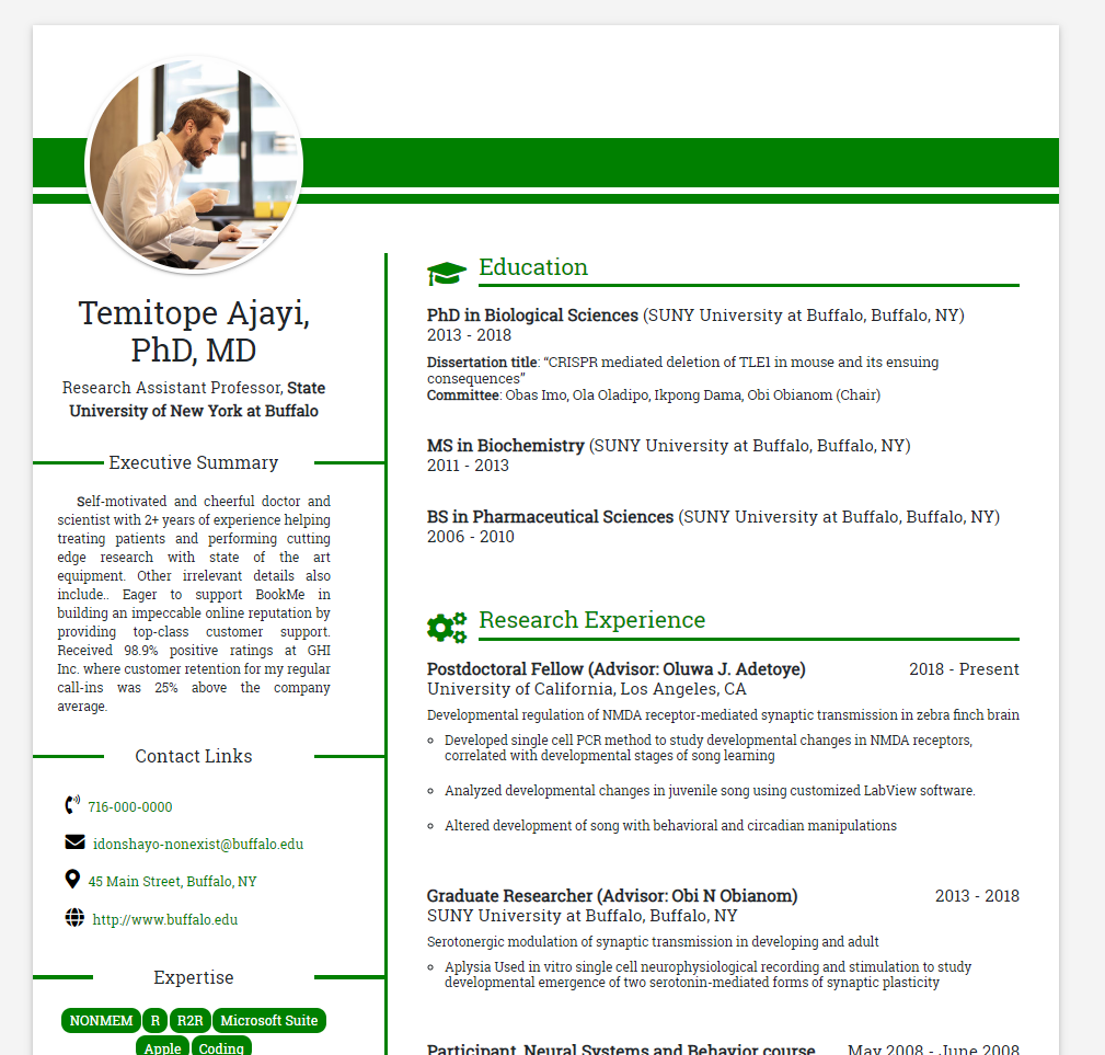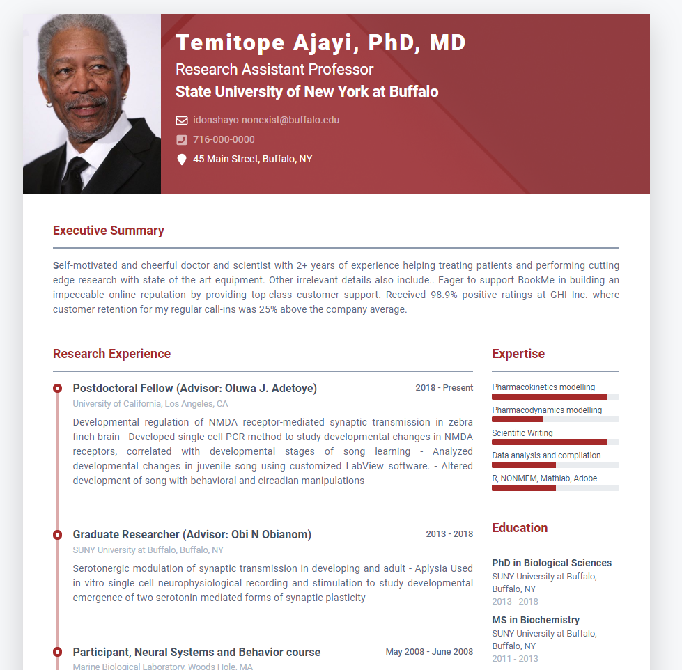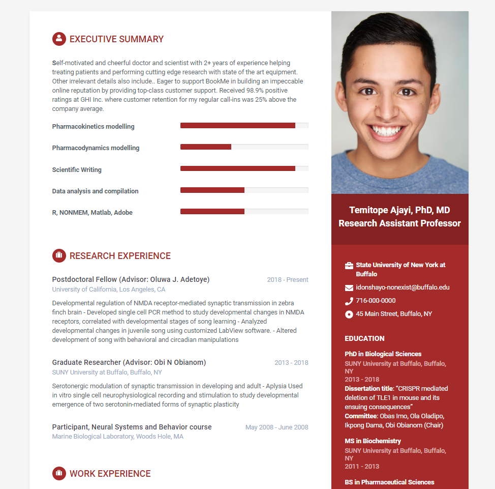 **S**elf-motivated and cheerful doctor and scientist with 2+ years of experience helping treating patients and performing cutting edge research with state of the art equipment. Other irrelevant details also include.. Eager to support BookMe in building an impeccable online reputation by providing top-class customer support. Received 98.9% positive ratings at GHI Inc. where customer retention for my regular call-ins was 25% above the company average.